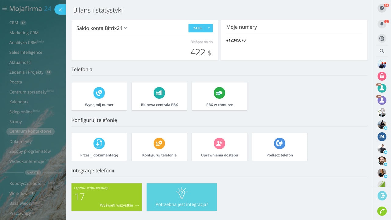 Telefonia Bitrix24 umożliwia wynajmowanie lokalnych numerów telefonów, tworzenie numerów wewnętrznych dla pracowników, konfigurowanie kolejkowania i przekierowywania połączeń itd.